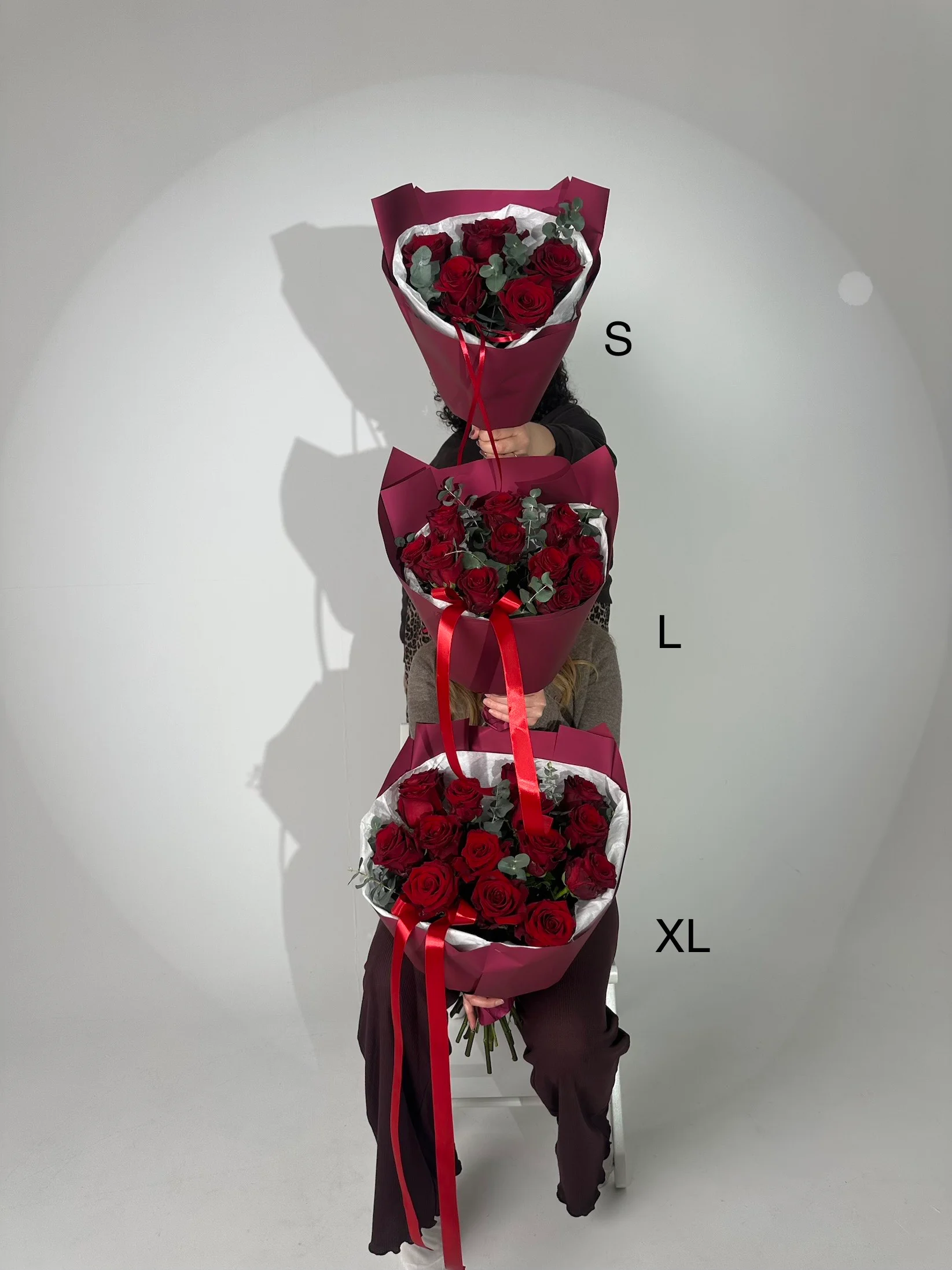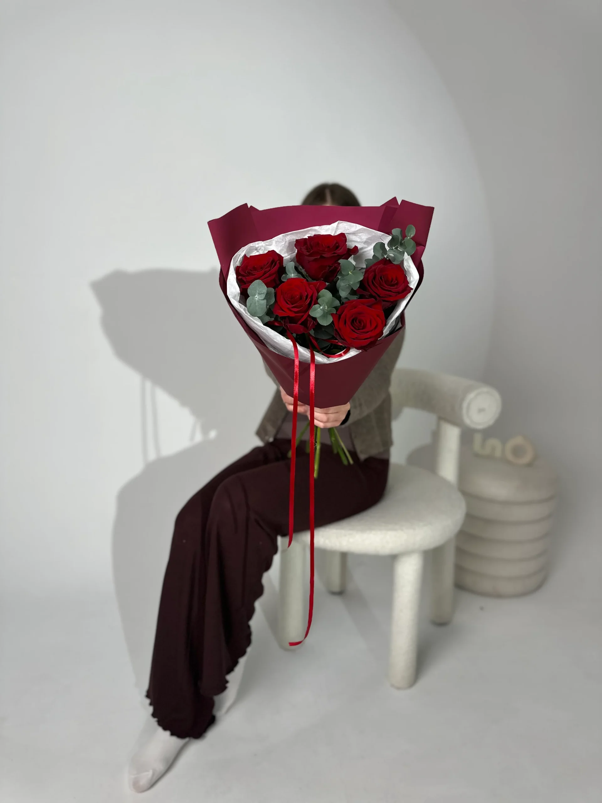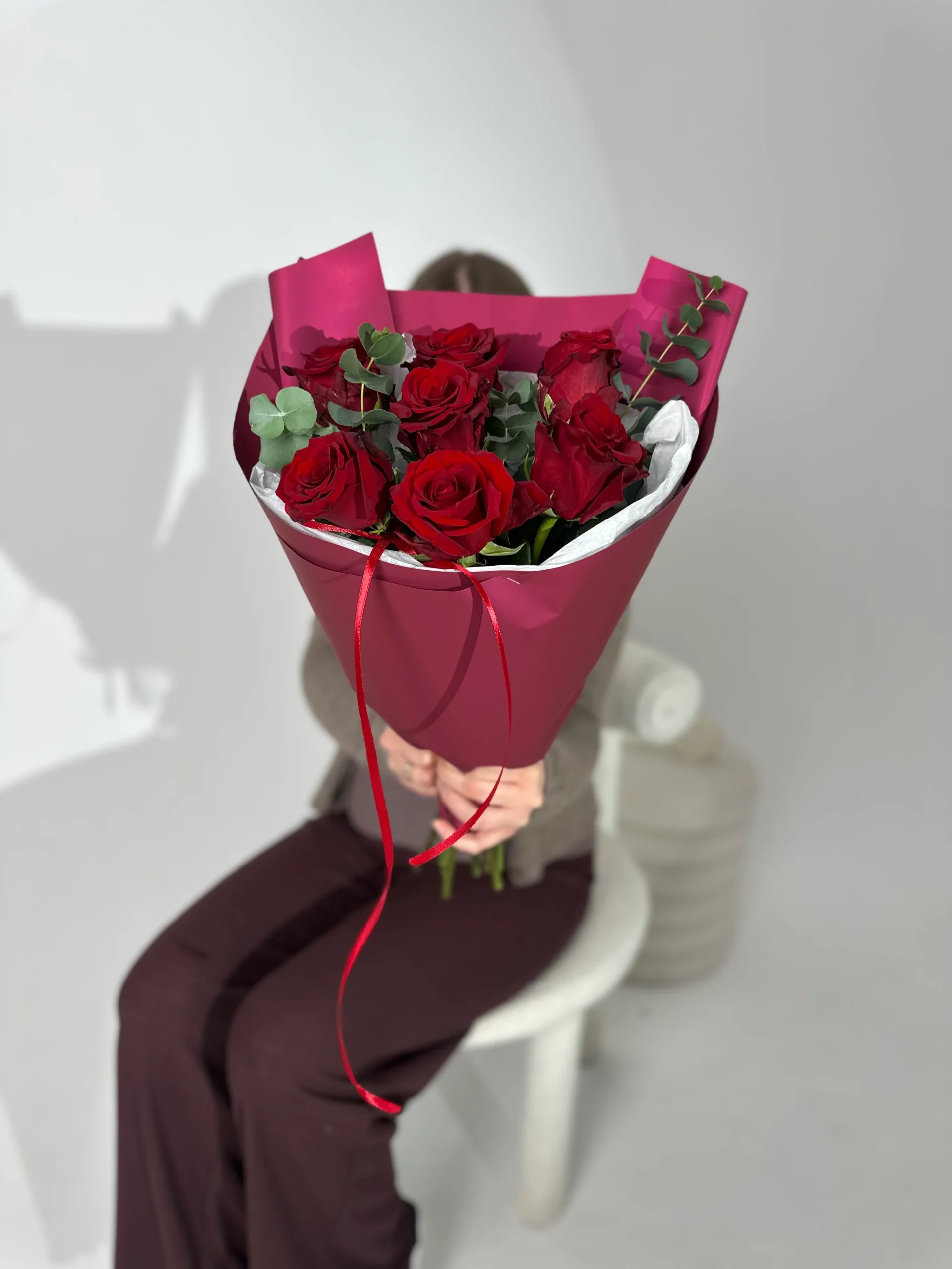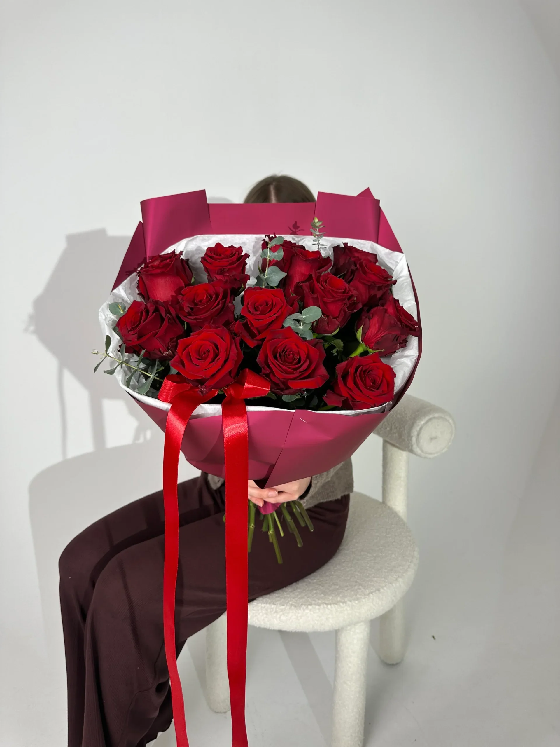 Klasyczny bukiet z czerwonych róż i eukaliptusa, ułożony w nowoczesnej formie. Całość otulona białą bibułką oraz bordowym papierem.